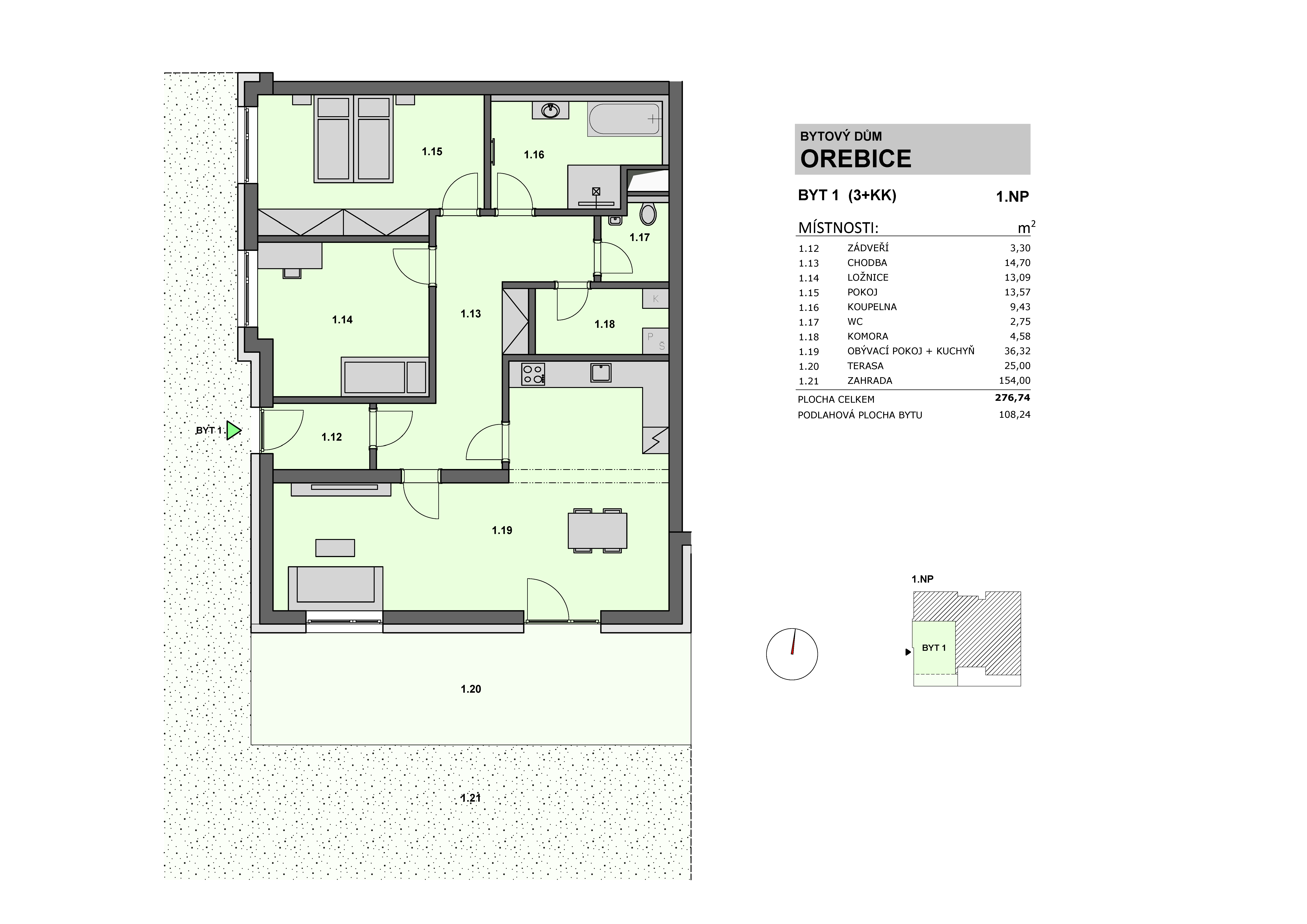 | 1 | 1 NP | 3+KK | 104,77 m2 | 25 m2 | 134 m2 | - | 2 | - | Schéma | prodáno |